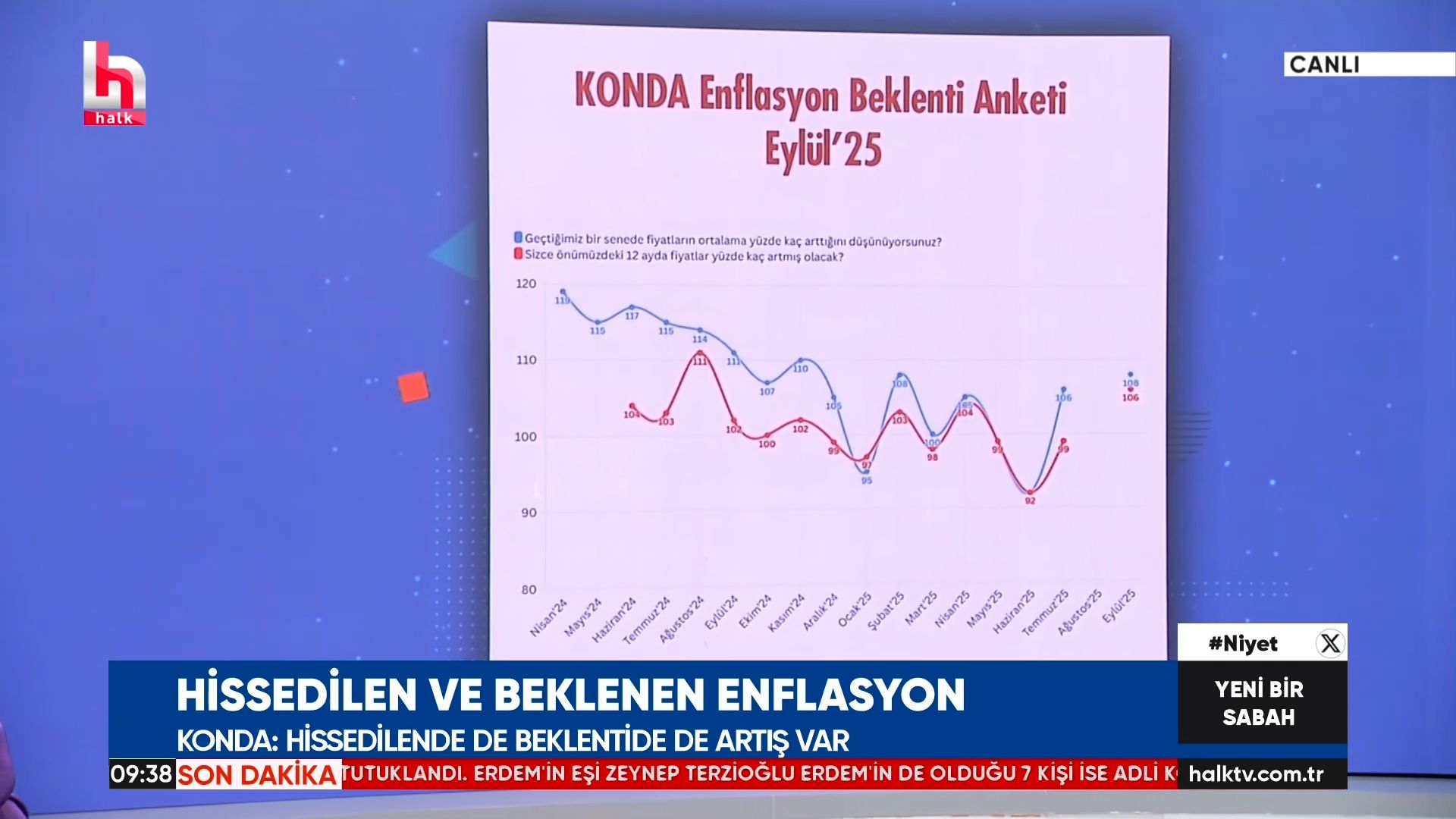 KONDA‘nın Eylül 2025 tarihli Enflasyon Beklenti Anketi’ne göre, halkın hem geride kalan yıl hem de önümüzdeki 12 ay için beklediği enflasyon yüzde 100 bandının oldukça üzerinde. Grafiklerde görülen mavi çizgi “gerçekleşen” değil, “halkın hissettiği” geçmiş enflasyonu; kırmızı çizgi ise “beklenen” enflasyonu temsil ediyor.