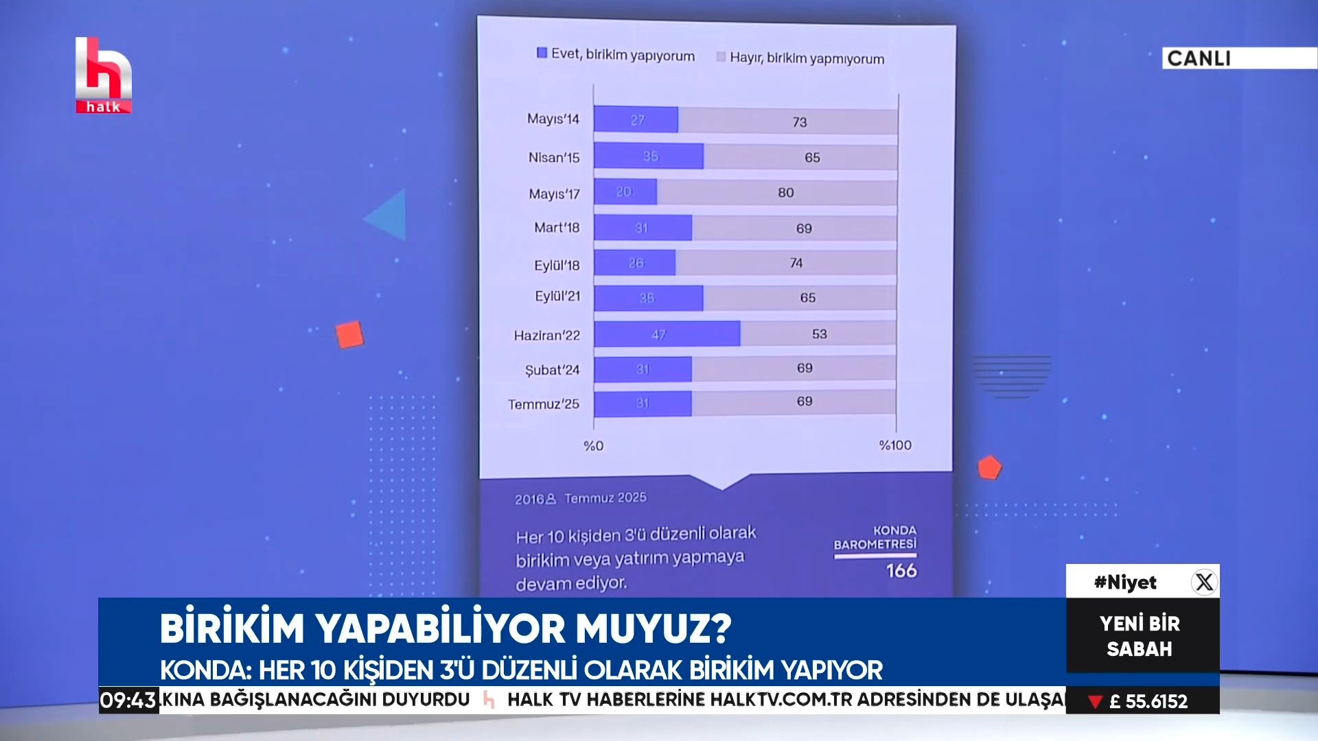 KONDA Barometresi verilerine göre, Türkiye’de düzenli olarak birikim ya da yatırım yapanların oranı yüzde 31. 2014’ten bu yana zaman zaman yükselse de bu oran, özellikle son bir yılda sabit kaldı.